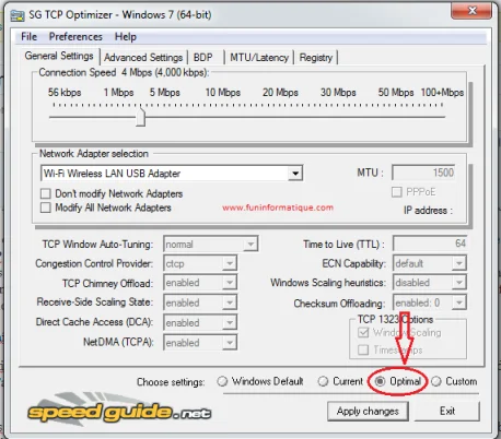 Tout d'abord, télécharger TCP optimizer, ensuite ouvrez l'application en mode Administrateur, puis cochez "Optimal" et validez par "Apply change". Redémarrer votre machine et le logiciel s'occupe de tout.