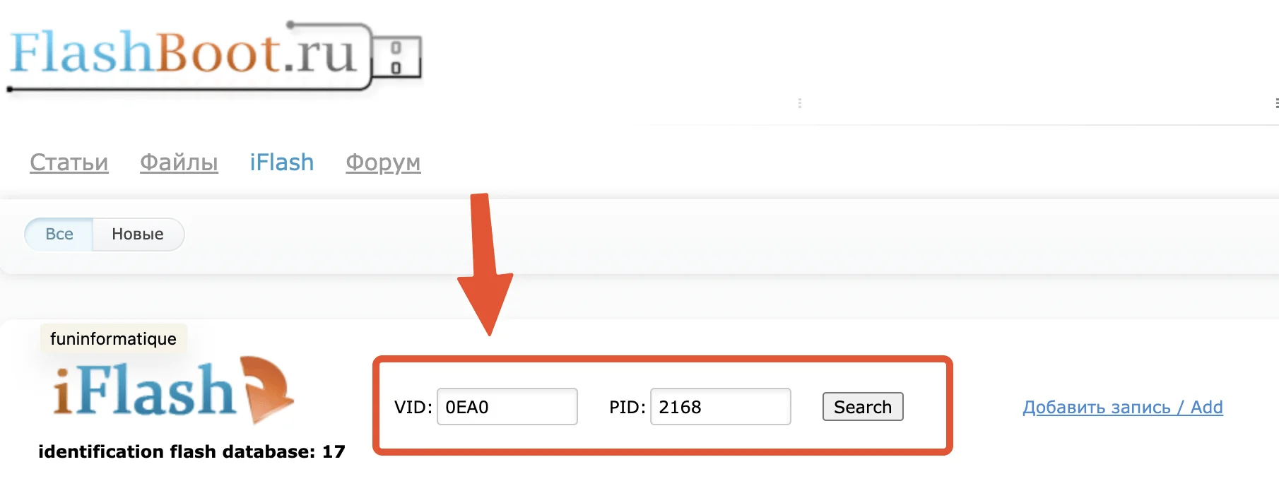 Ensuite, copiez le VID et le PID, puis utilisez-les pour rechercher sur le site https://flashboot.ru/iflash/.