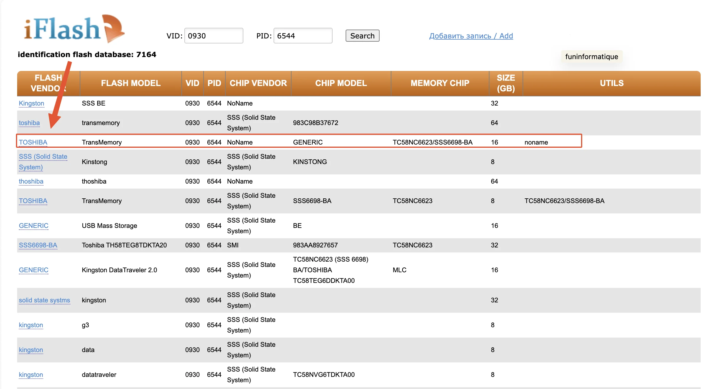 Sur la page de résultats, vérifiez la taille de la mémoire de la clé USB dans la colonne "Memory". Ensuite, copiez le nom du fabricant dans la première colonne.