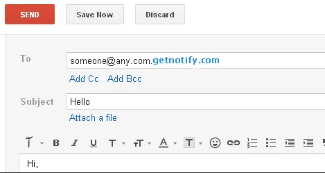 Par exemple, pour suivre un email envoyé à « cible@gmail.com », envoyez le à « cible@gmail.com.getnotify.com ».