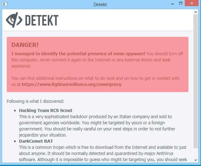 Enfin, si Detekt trouve que vous êtes infecté, alors il faut tout arrêter et procéder au nettoyage et à la sécurité de votre ordinateur.