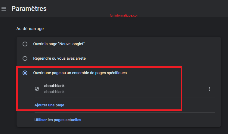 Une fois que vous avez trouvé, vous allez voir que vous pouvez sélectionner la page a l’ouverture du navigateur. Faites le choix de mettre une page personnalisé et tapez simplement about:blank dans la barre qui vient d'apparaître. Le tour est désormais joué.