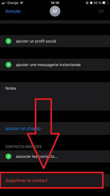 - Ici, vous pouvez supprimer ce contact. Si vous supprimez une entrée, l'autre deviendra la principale.