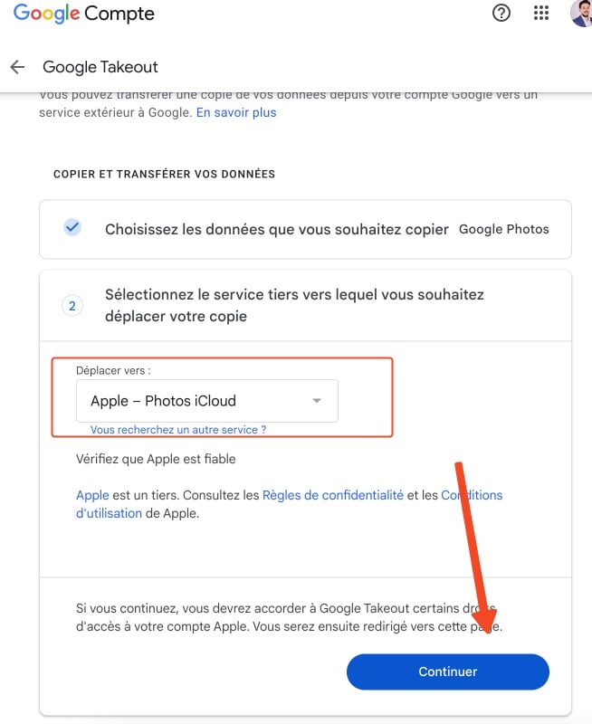 - Dans le menu déroulant sous "Déplacer vers", choisissez "Apple – iCloud Photos", puis cliquez sur "Continuer".