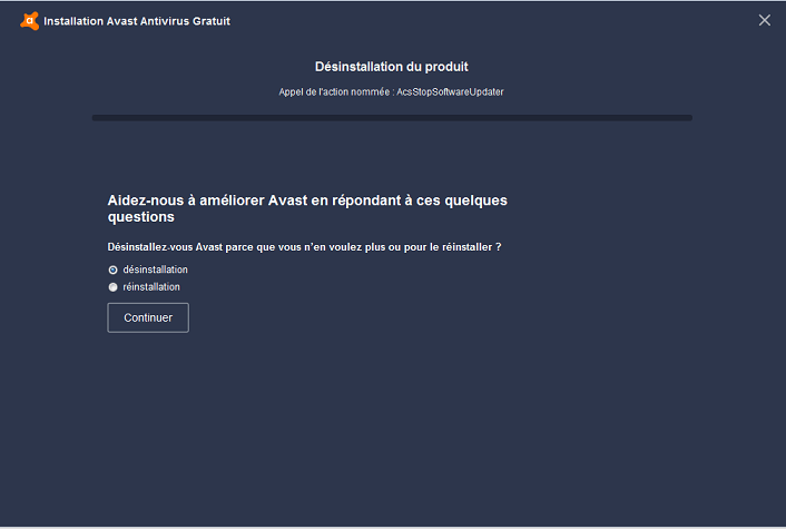 Lorsque l’assistant d’installation d’Avast apparaît, cliquez sur Désinstaller.