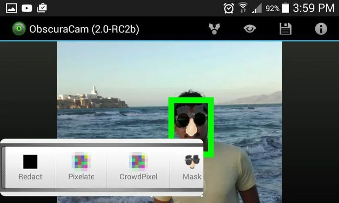 L’application va détecter les visages. Si elle a «oublié » quelqu’un, vous pouvez ajouter un masque ou en supprimer un. Vous pouvez utiliser ObscuraCam pour masquer certains ou tous les visages qui apparaissent sur vos photos.
