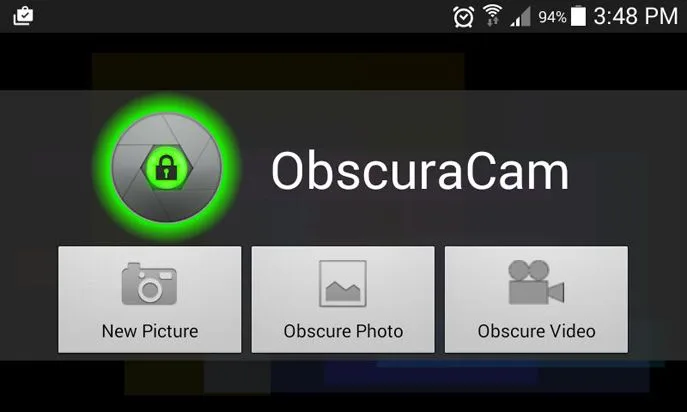 L’application ne nécessite pas l’accès root. Dans le menu vous aurez le choix entre prendre une nouvelle photo (qui sera automatiquement traitée par ObscuraCam) ou ouvrir une photo/vidéo déjà existante.