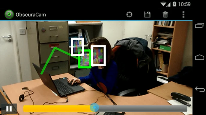 Notez que le système de reconnaissance faciale d’ObscuraCam ne fonctionne pas toujours bien, surtout dans des vidéos où les personnes bougent beaucoup, mais il vous est toutefois toujours possible de facilement sélectionner et flouter les visages manuellement.