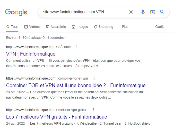 | site | retourne les fichiers localisés sur un domaine particulier | site:www.funinformatique.com VPN trouvera toutes les pages contenant le mot VPN dans leur texte et se trouvant dans le domaine www.funinformatique.com |