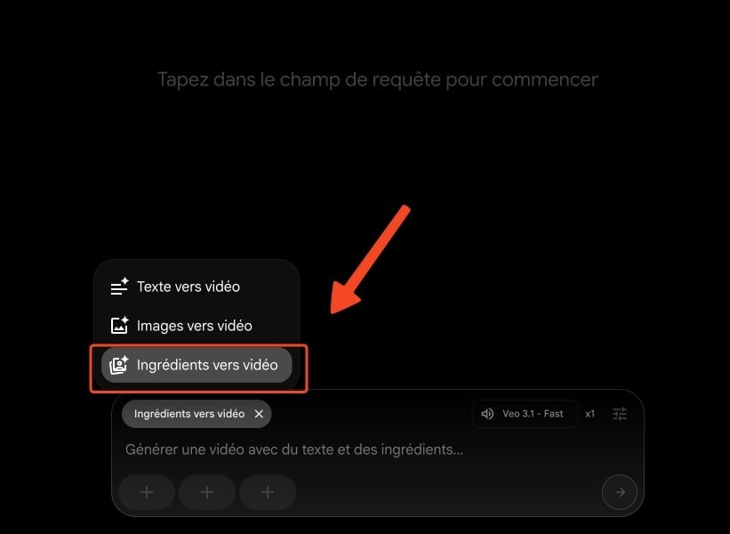 Vous avez essentiellement trois options de génération, et on va commencer par la plus puissante : Ingredients to Video.