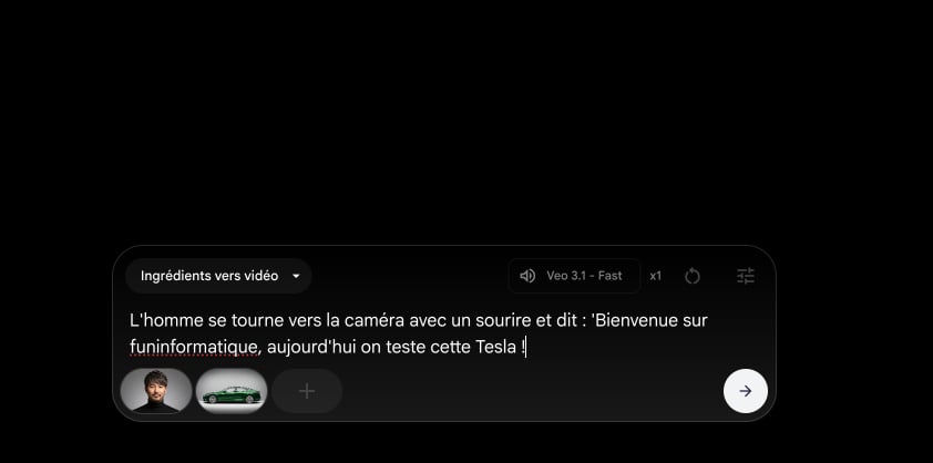 Si vous avez utilisé deux ingrédients, décrivez comment ils interagissent dans votre prompt : "L'homme ouvre la portière de la voiture et monte à l'intérieur" ou "L'homme marche autour de la voiture en l'admirant". Flow comprendra qu'il doit combiner les deux ingrédients dans la même scène.