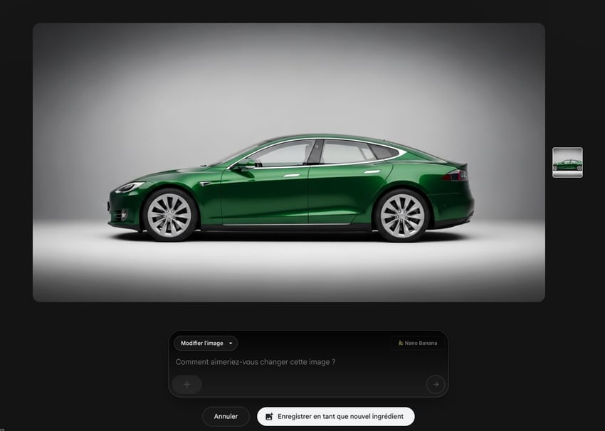 Si vous voulez ajouter un deuxième ingrédient (par exemple une voiture), cliquez sur le deuxième emplacement + et répétez le processus. Décrivez votre objet : "Voiture Tesla verte, modèle récent, vue de profil, fond neutre". Générez et sauvegardez cet ingrédient également.